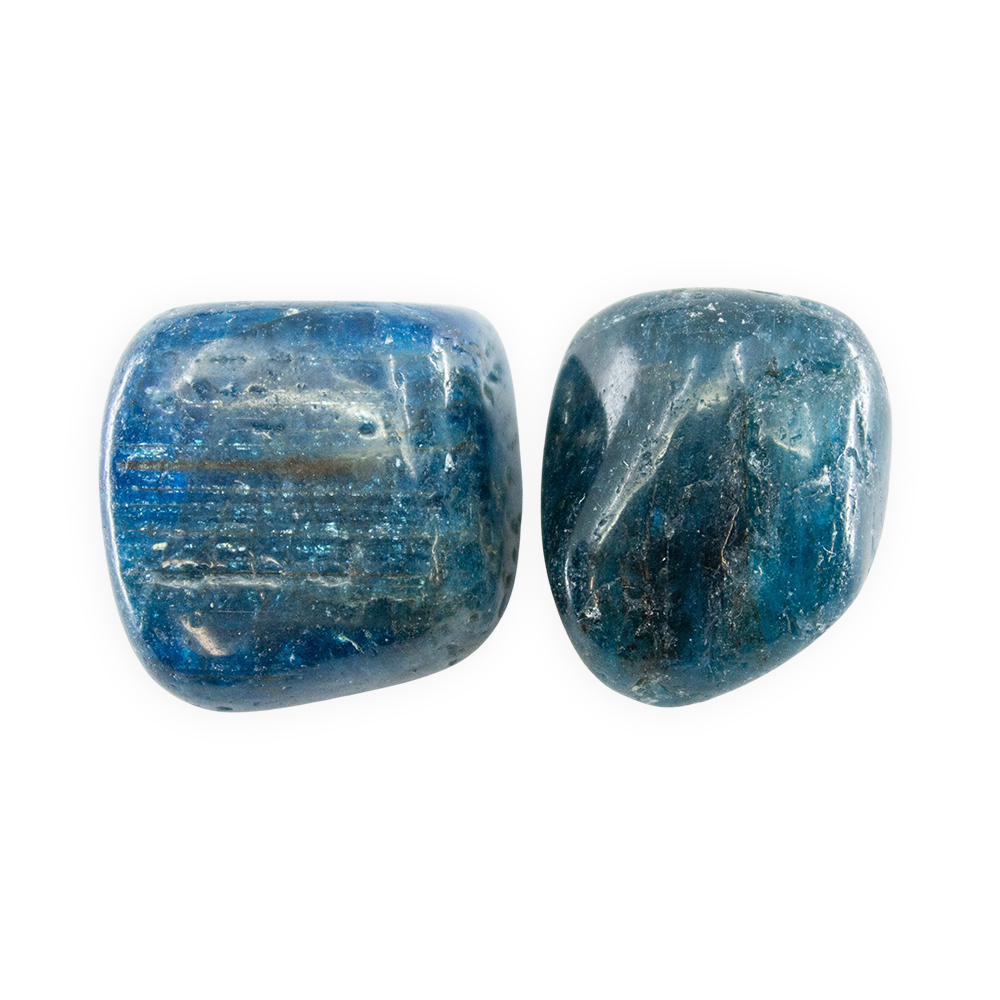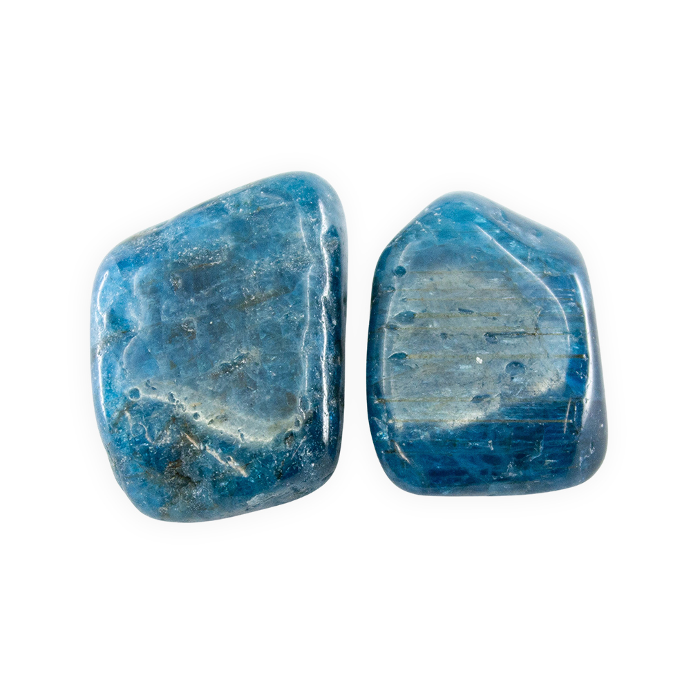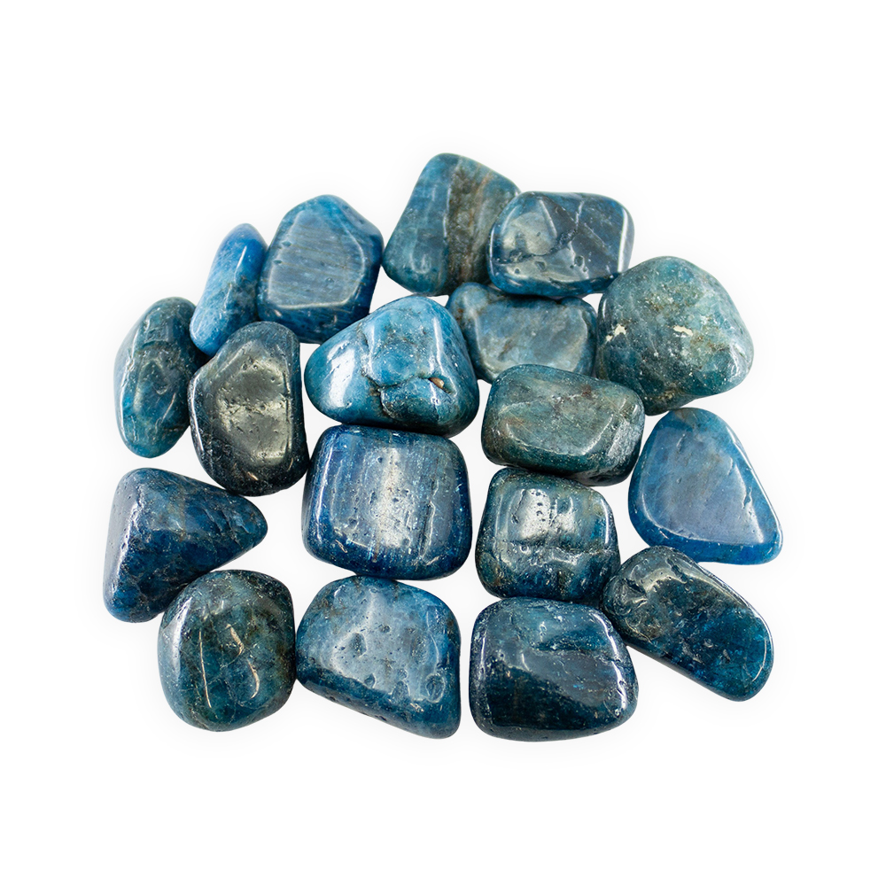 Description: Blue Apatite Tumbled Set. The name “apatite” refers to unidentified calcium phosphate minerals that belong to the apatite group. The most common “apatite” is fluorapatite, while hydroxylapatite and chlorapatite are far less common.