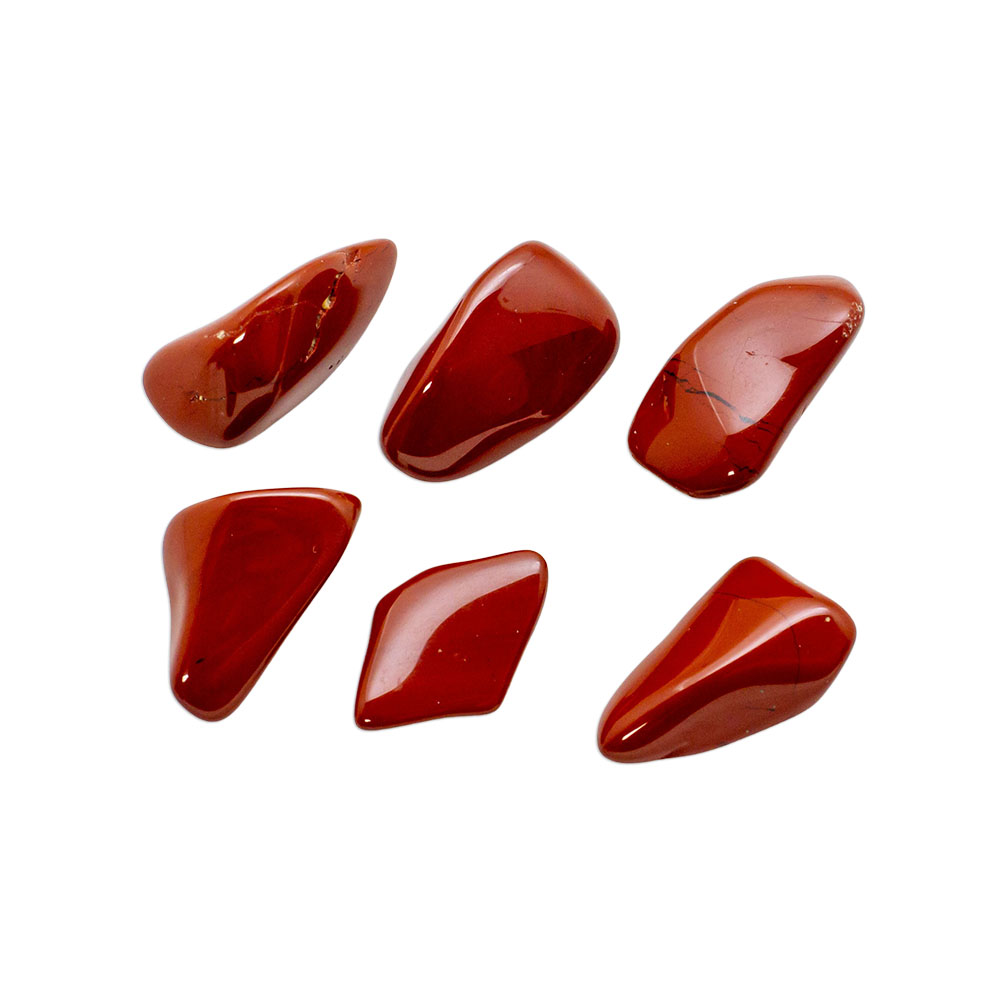 Description: Red Jasper Tumbled Set. Red Jasper is an opaque, microcrystalline variety of Quartz with large, grainy crystals rather than the fibrous layers of Chalcedony or Agate. It occurs in nodules or as fillings in fissures and may be found worldwide. Its vibrant red to terracotta red-brown is due to its high iron content and may contain other minerals or impurities that create rich patterns.