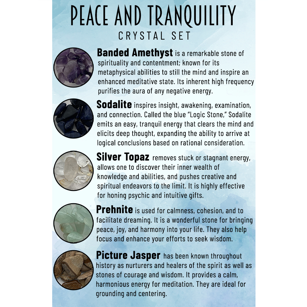 The Peace and Tranquility Crystal Set includes Banded Amethyst, Sodalite, Silver Topaz, Prehnite, and Picture Jasper.