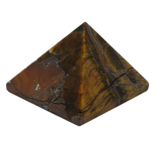 Description: Tiger’s Eye Pyramid. Tiger’s Eye is a formation of millions of petrified fibers with a diameter of 0001 mm. or finer. Embedded in heavy iron formation, each fiber reflects light at a different angle, hence the shimmering effect. You will receive the typical item shown.