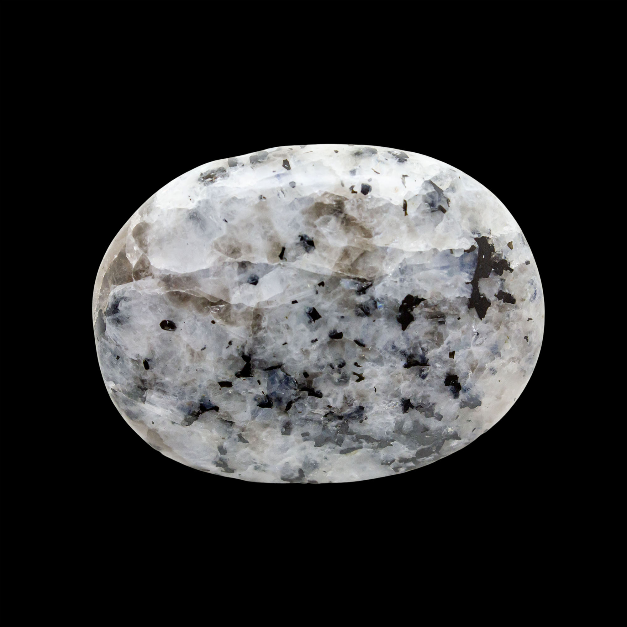 Description: Rainbow Moonstone Palm Stone. They do contain some natural cracks and fractures. Rainbow moonstone typically has a creamy, translucent white appearance and varies in transparency from opaque to semitransparent. It occasionally exhibits iridescent or multicolored flashes, particularly blue ones.