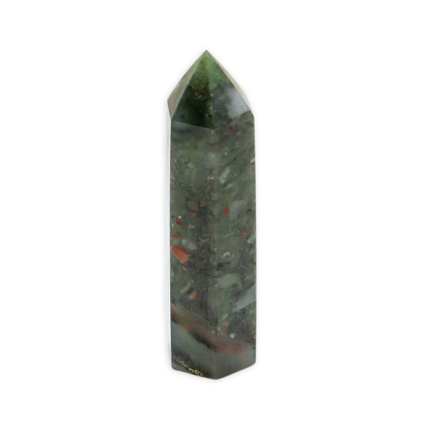 Description: Bloodstone Point. Beautiful swirls of jades and deep forest greens in a paisley pattern. The colors are a great mix of light and dark green with traces of magenta and red. Bloodstone (Heliotrope) may be classified as a Jasper or Chalcedony variety of Quartz and is usually a combination of the two. It is typically defined as a dark green Chalcedony with blood-like spots of Red Jasper or iron oxide inclusions.
