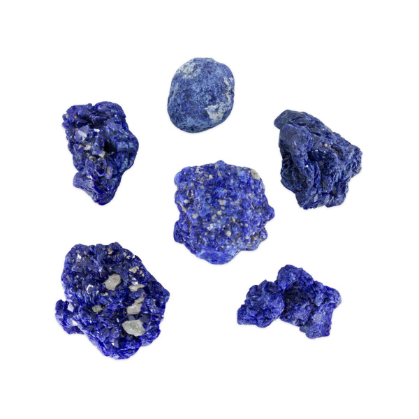 Description: Azurite Rough Set. Azurite is a soft stone, named for its deep “azure blue” color. It is a copper carbonate mineral found in the upper oxidized portions of copper ore. The saturated color ranges from bright to deep blue into shades of indigo, and may contain streaks of light blue.