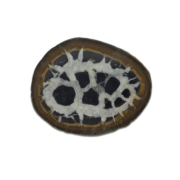 Description: Â Septarian Nodule Slab. Â Septarian is a mixture of Aragonite, Calcite, and Limestone. The name Septarian comes from the Latin word “septem”, meaning seven because it seems to form in patterns of seven. The yellow-colored material is Calcite, the brown is Aragonite, and the outer grey is limestone. The energy is pure Earth brown.