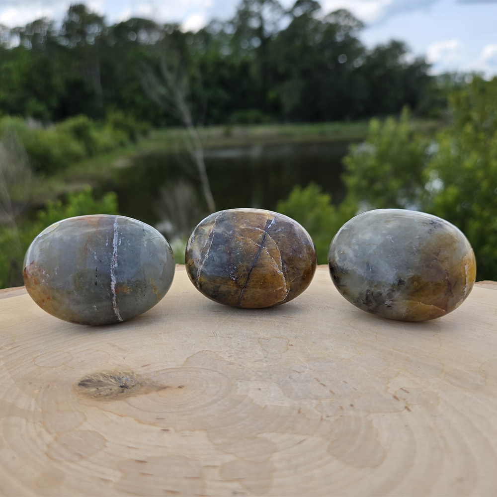 Description: Golden Healer Quartz, also known as Hematoid Quartz. Golden Healer Quartz is the name of Quartz that is colored by the iron oxide trapped inside the crystal. They vary in color from pale yellow to a deep rust color. The yellow and brownish versions are known as Golden Healer Quartz, while the red versions are known as Fire Quartz. This particular palm stone contains traces of Pyrite – a powerful combination!
