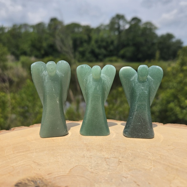Description: Green Aventurine Angel. Aventurine is a variety of Quartz characterized by bright inclusions of Mica or other minerals that give a shimmering or glistening effect to the stone, referred to as aventurescence, especially notable when tumbled or polished.