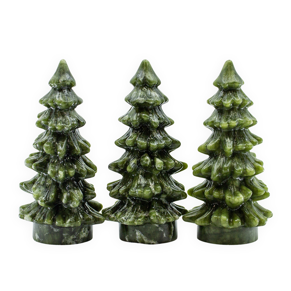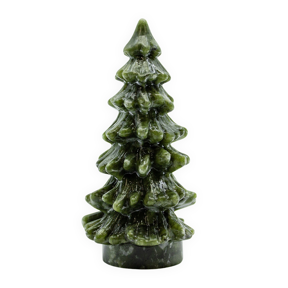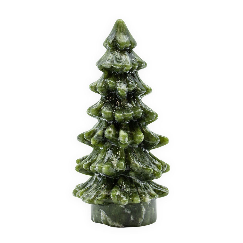 Description: Nephrite Jade Christmas Tree. Nephrite Jade is a metamorphic rock composed mainly of two mineral species: tremolite and actinolite, both of which are part of the amphibole group of minerals. The color of Nephrite Jade can range from creamy white to pale green, dark green, brown, and even black, depending on the presence of different trace elements and minerals. The green color is often due to the presence of iron.