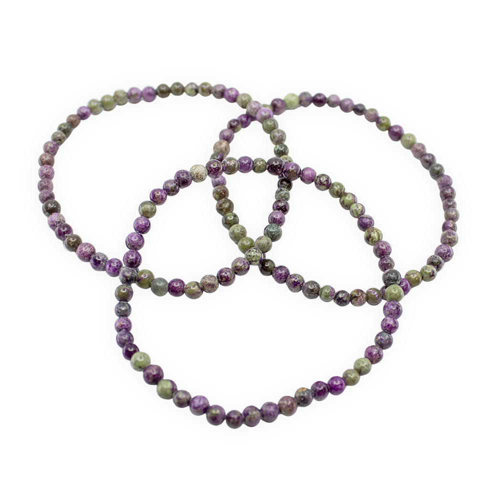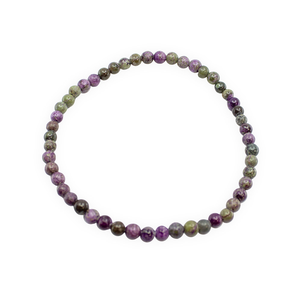 Description: Atlantisite Bracelet 4 mm. Atlantisite is a mixture of Serpentine and Stichtite. Serpentine is a green mineral known for its soothing and cleansing properties, while Stichtite is a purple mineral associated with emotional healing and compassion.