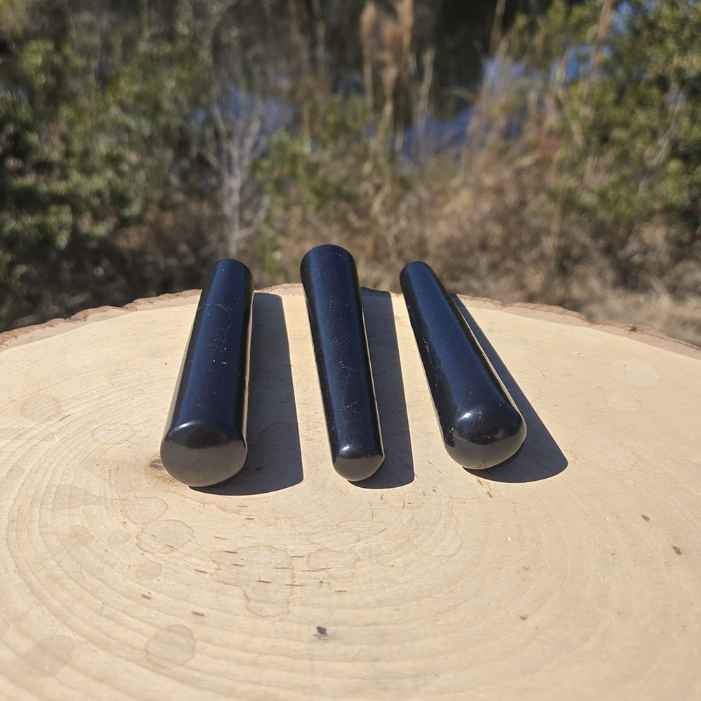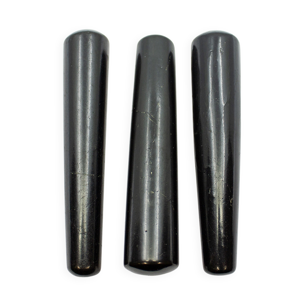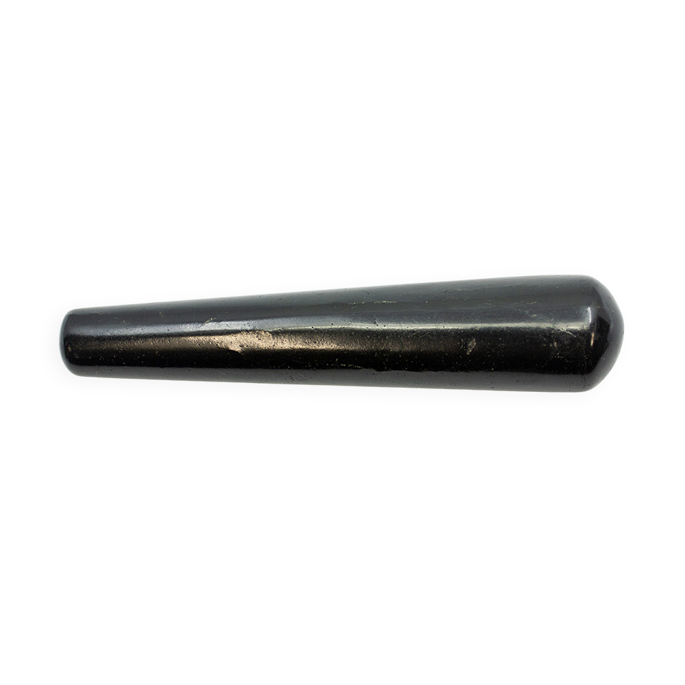 Description: Shungite Tapered Massage Wand. This stone does contain natural cracks, fractures, and marks. Shungite is a form of elemental carbon, just like a diamond. It has a natural mirror effect and is jet black.