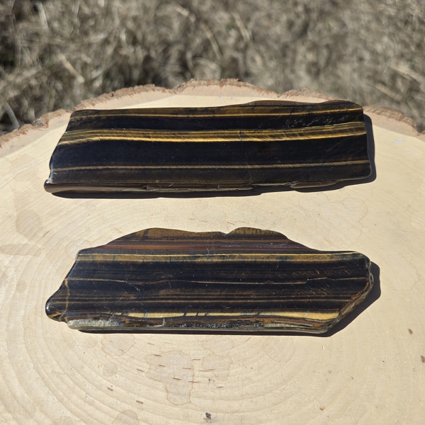 Description: Tiger’s Eye Polished Slab. Tiger’s Eye is a formation of millions of petrified fibers with a diameter of 0001 mm. or finer. Embedded in heavy iron formation, each fiber reflects light at a different angle, hence the shimmering effect.