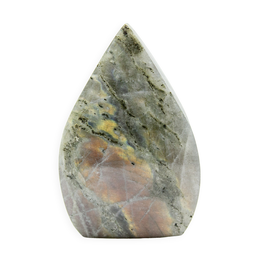 Description Sunset Labradorite Freeform. Labradorite is a member of the Feldspar family and is treasured for its remarkable play of color, known as labradorescence. The stone, usually gray-green, dark gray, black, or grayish-white, is composed of aggregate layers that refract light as iridescent flashes of peacock blue, gold, pale green, or coppery red.