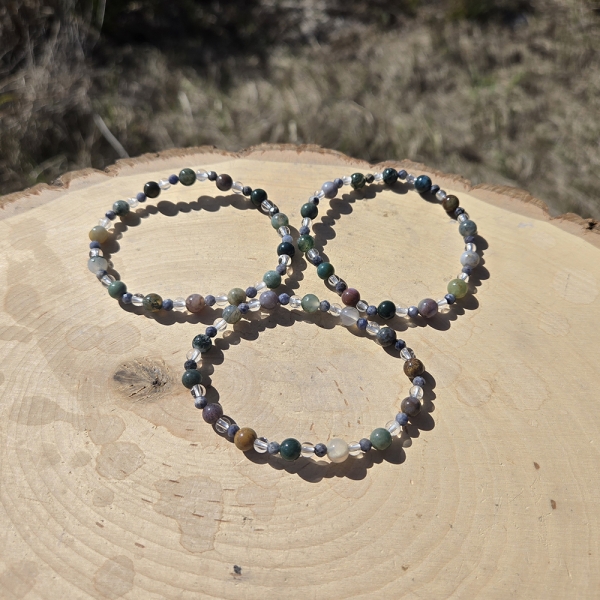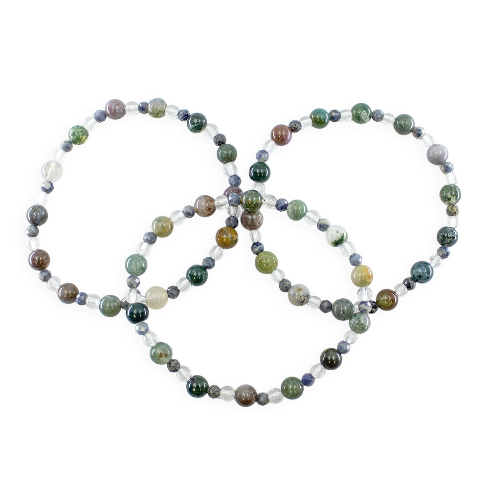 Size: 6 mm Moss Agate, 4 mm Clear Quartz and Faceted Sapphire crystal beads. Diameter approximately 2.5 inches. Made with durable stretch cord.