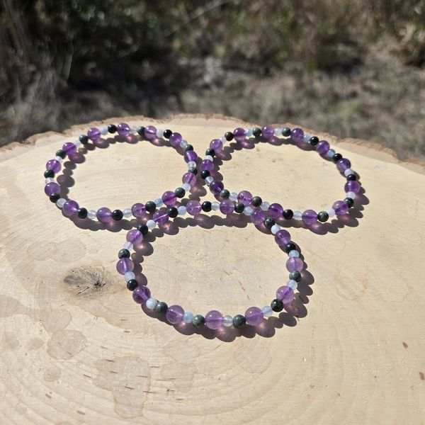 Size: 6 mm Amethyst, 4 mm Aquamarine and 4 mm Kambaba Jasper crystal beads. Diameter approximately 2.5 inches. Made with durable stretch cord.